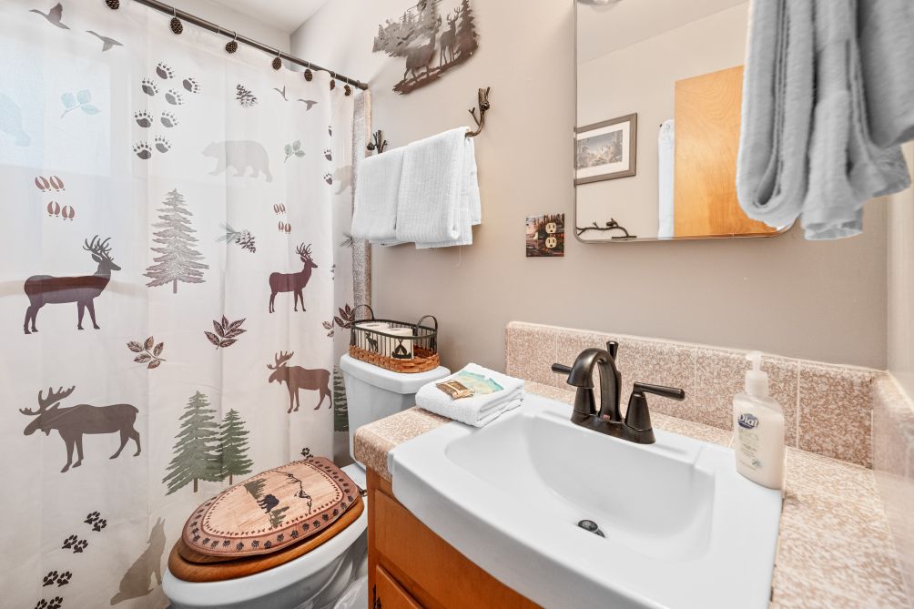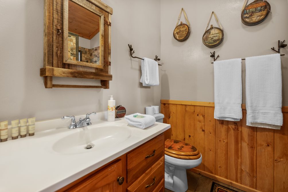 The cabin's interior is thoughtfully designed to provide a cozy atmosphere, highlighted by a smart TV and a laptop-friendly workspace for those who need to stay connected.