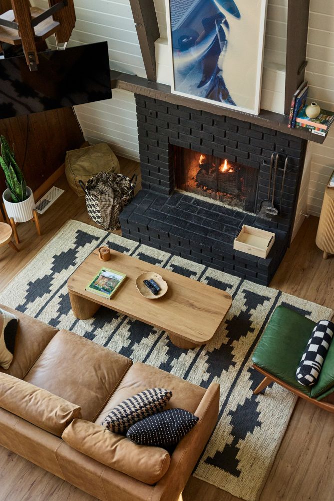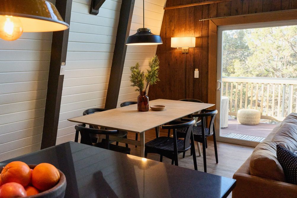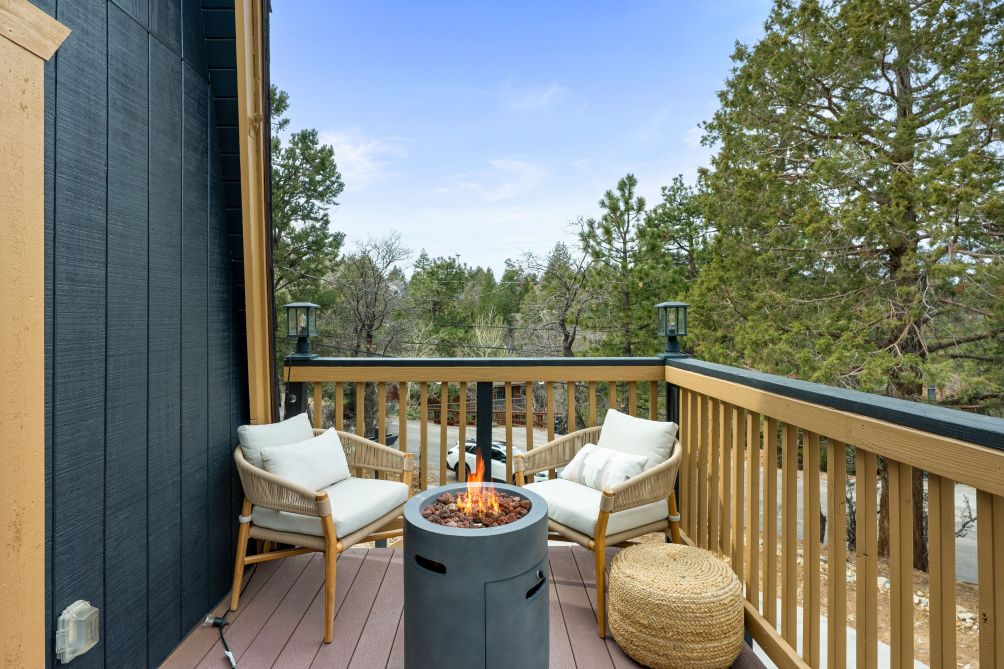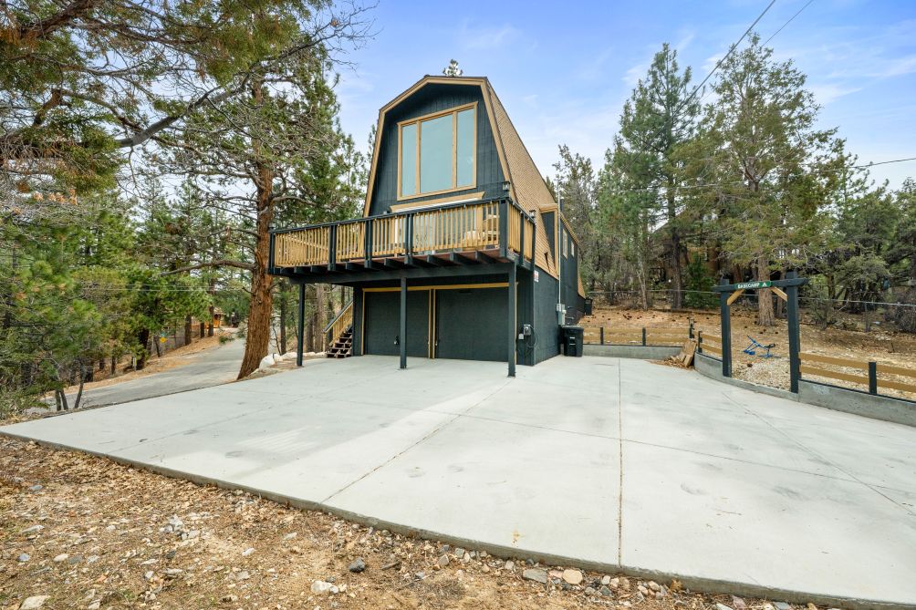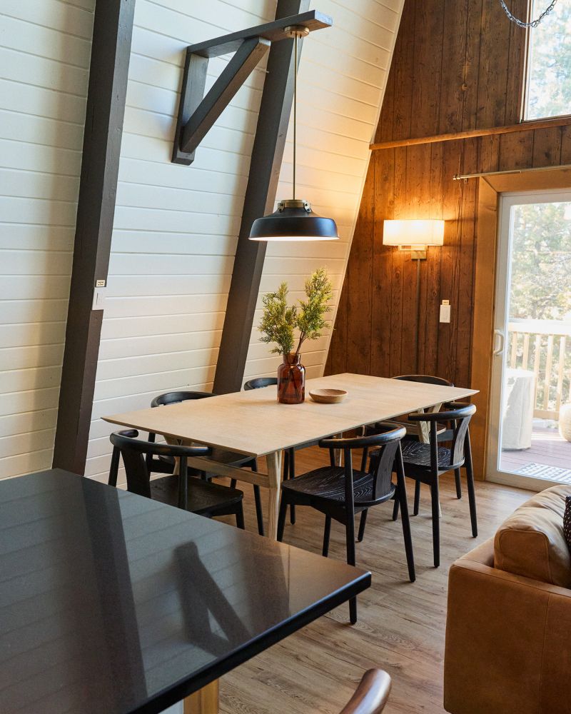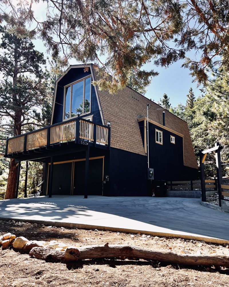 Welcome to Basecamp, a modern A-frame retreat nestled in the serene beauty of Big Bear, California. This architectural gem offers a unique escape with its striking design and tranquil mountain views. Inside, the home features a warm and inviting ambiance, accentuated by a cozy fireplace and elegant hardwood flooring.